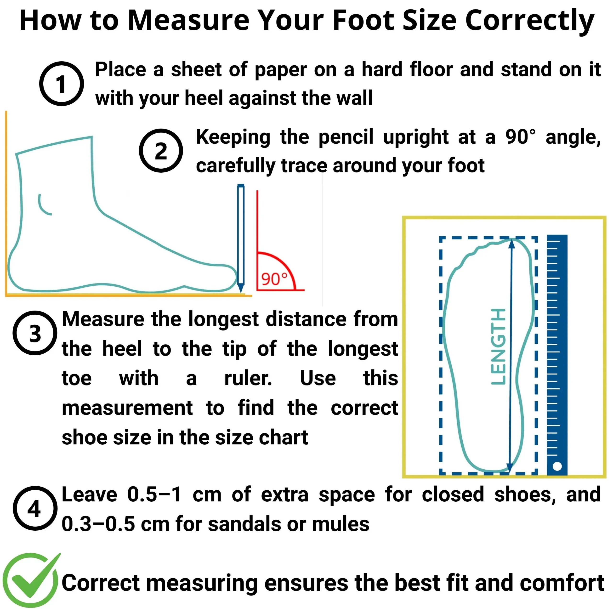 EU 47 / US 13 → 29.5 cm (11.6 in) 👉 For closed shoes, please add 0.5–1 cm extra to your foot length.